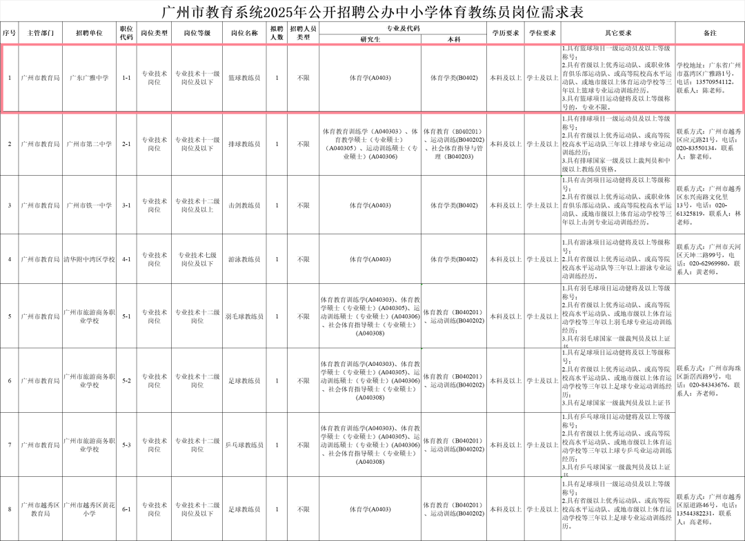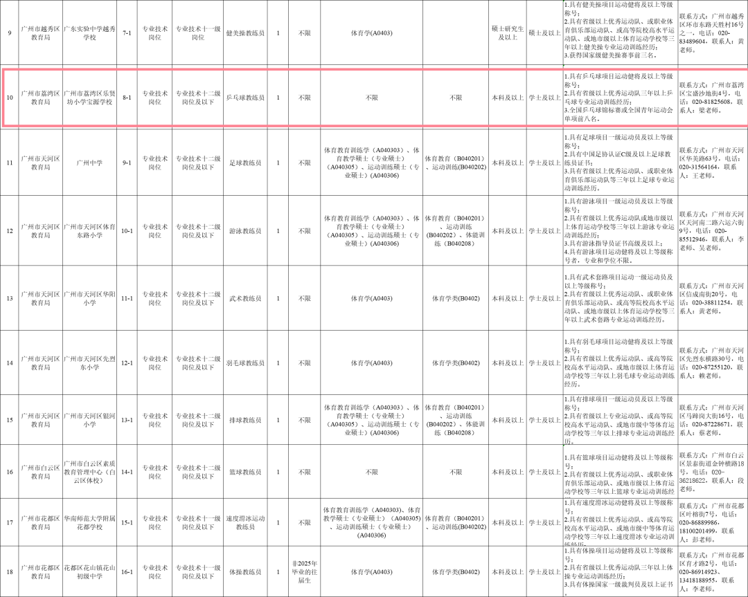 广州市教育系统近期公开招聘公办中小学体育教练员18名。其中,荔湾区的广雅中学和乐贤坊小学宝源学校分别招1名篮球教练员以及1名乒乓球教练员。