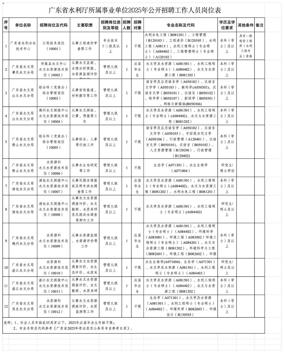 广东省水利水电技术中心和省水文局各直属分局等单位面向社会公开招聘12名工作人员。